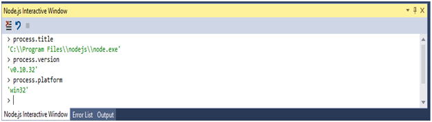 安裝完成后我們就會運行 Visual Studio Express 2013 for Web, 并使用 Node.js 的交互窗口來驗證安裝. Node.js 的交互窗口可以再 View->Other Windows->Node.js Interactive Window 下找到. Node.js 交互窗口運行后我們要輸入一些命令檢查是否一切OK.