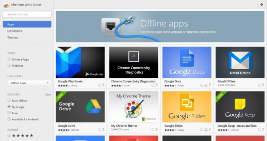 如今有好一些應用程序不需要網(wǎng)絡鏈接就能夠離線使用,比如 Gmail 郵箱、谷歌硬盤和谷歌日歷。這對那些不能使用網(wǎng)絡或經(jīng)常出差工作的用戶來說是理想辦公工具。用戶可以從 Chrome 應用商店安裝離線擴展程序,并使用 Chrome 應用啟動器或 Chrome 瀏覽器來打開這些程序。