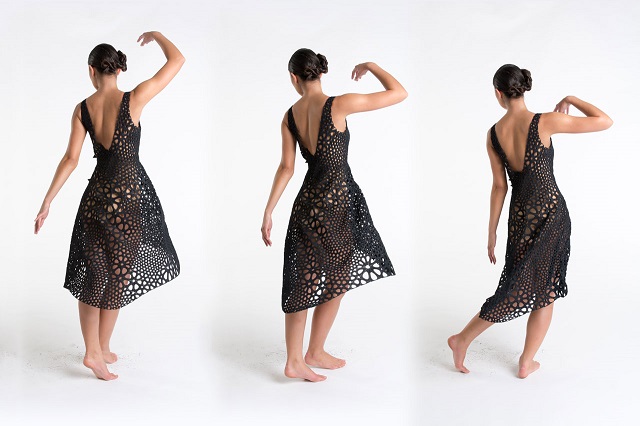 在定制化生產(chǎn)之后,服裝生產(chǎn)的下一步可能就會進入 3D 打印時代,該技術允許你按照自己的設計一次只打印一件成品。人們將進入「實時消費」階段:你可以每天為自己打印不同的鞋子與耳環(huán)。如今花不到 100 美元你就可以獲得 3D 打印的定制珠寶,3D 打印的鞋子也為之不遠了。Nervous System 設計工作室甚至能夠為用戶提供名為 Kinematics 的 3D 打印晚禮服。這款 3D 打印晚禮服所使用的服裝材料為數(shù)千個相互連接的硬體塑料環(huán)。3D 打印服飾通常需要在打印之后另行組裝,因為它們體積太大無法一次性打印完畢。Kinematics 的制作過程也是如此,你需要將其打印成一整張,然后經(jīng)過折疊成為最終成品。3D 打印的晚禮服一件就需要約 4000 美元,因此距今為止只賣出了不到 12 件(其中還有一件去年被紐約現(xiàn)代藝術博物館購買作為藏品)。