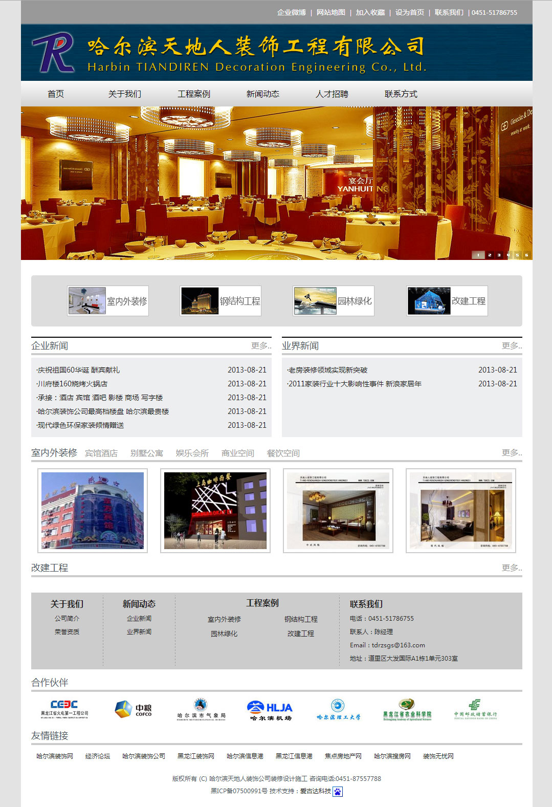 天地人裝飾工程有限公司成立于2001年4月,是國(guó)家建筑裝飾裝修貳級(jí)資質(zhì)企業(yè),同時(shí)具有建筑裝飾設(shè)計(jì)乙級(jí)資質(zhì)。公司在哈爾濱市同行業(yè)中率先通過(guò)了ISO9001-2000國(guó)際質(zhì)量管理體系認(rèn)證。