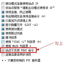 經(jīng)過幾次嘗試,使用被動模式,該站點禁用“強制主動模式使用該IP”,取消使用MLSD列目錄,使用“STAT -L”列目錄等等,最后還是將“站點不支持 FEAT 命令”勾上后好使了,如圖: