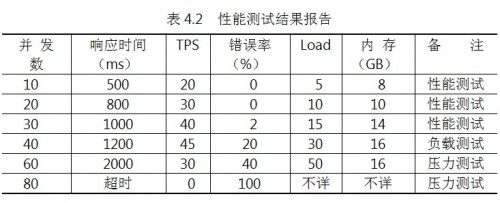 測試結果報告應能夠反映上述性能測試曲線的規(guī)律,閱讀者可以得到系統性能是否滿足設計目標和業(yè)務要求、系統最大負載能力、系統最大壓力承受能力等重要信息,表4.2是一個簡單示例。