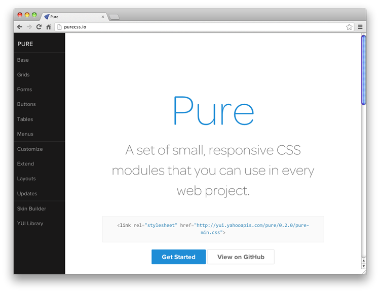 Pure CSS 來自雅虎,是一組 CSS 模塊,您可以作為基礎在每一個 Web 項目中使用。它使 CSS 開發(fā)更容易,整個框架看起來很干凈,專業(yè)。如果你還沒有用過的話,嘗試一下!更多信息: http://purecss.io/