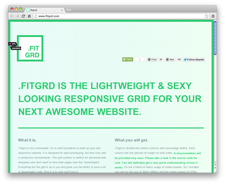.Fitgrd 是一個輕量的響應式網(wǎng)格系統(tǒng),是建立你自己的響應式網(wǎng)站的堅實的基礎。更多信息: http://www.fitgrd.com/