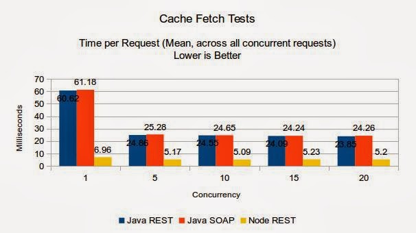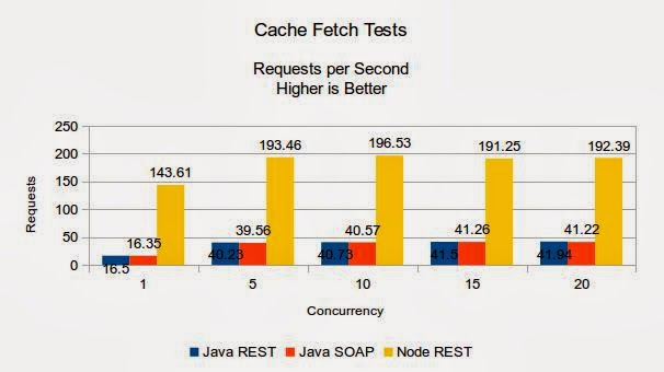 我最近做了一些簡(jiǎn)單的關(guān)于內(nèi)存的Web Service性能測(cè)試。我使用Java(REST + SOAP)和Node.js(REST)將一些接口功能緩存起來(lái)。跟期望的一樣,Node應(yīng)用的性能遠(yuǎn)遠(yuǎn)超出Java。(響應(yīng)時(shí)間至少快1倍以上)。
