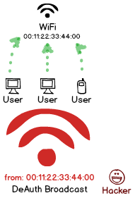 之前提到,遍歷 PPPoE 的會(huì)話ID,冒充所有用戶發(fā)出注銷(xiāo)請(qǐng)求,可以斷開(kāi)全城的網(wǎng)絡(luò)。WiFi 也有類(lèi)似的缺陷,只不過(guò)正好反過(guò)來(lái):冒充熱點(diǎn),向所有用戶廣播注銷(xiāo)包,于是所有連著該熱點(diǎn)的用戶都下線了。