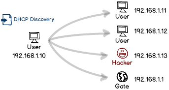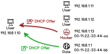尚若黑客也在內(nèi)網(wǎng)里也開(kāi)啟了 DHCP 服務(wù),用戶收到的回復(fù)包很可能就是黑客發(fā)出的,這時(shí)用戶的網(wǎng)絡(luò)配置完全聽(tīng)天由命了,不想被劫持都難了。