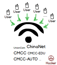 不用說(shuō),你也想到開(kāi)熱點(diǎn)釣魚(yú)了。并且用戶幾乎都是用 WiFi 來(lái)連接,也就沒(méi)有必要使用 WLAN 設(shè)備。使用之前的大功率熱點(diǎn),取個(gè) CMCC 的名字,放在陽(yáng)臺(tái)上對(duì)著大街,不一會(huì)就連上一堆用戶了。要是支持虛 AP 的話,把 CMCC-AUTO,ChinaNet 等等這些名字全部用上,前來(lái)光臨的就更多了。