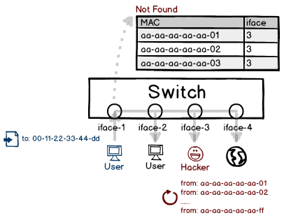 然而這種學(xué)習(xí)并不智能,甚至太過(guò)死板,任何一個(gè)道聽(tīng)途說(shuō)都會(huì)當(dāng)作真理。用戶發(fā)送一個(gè)自定義源 MAC 地址的包是非常容易的,因此交換機(jī)成了非常容易被忽悠的對(duì)象。只要偽造一個(gè)源地址,就能將這個(gè)地址關(guān)聯(lián)到自己的接口上,以此獲得受害者的流量。