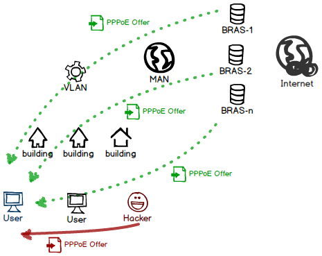 類(lèi)似 DHCP 協(xié)議,PPPoE 也是通過(guò)廣播來(lái)探尋有哪些可用的終端,意味著整個(gè)小區(qū)的內(nèi)網(wǎng)用戶都能收到;同時(shí)探尋包一直往上冒泡,直到被城域網(wǎng)的終端們收到,然后開(kāi)始紛紛回應(yīng)。
