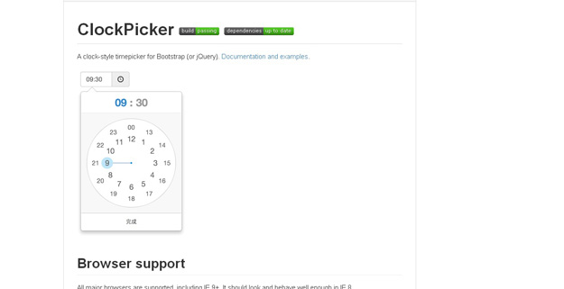 一個時鐘分割的時間拾取器的Boostrap的jQuery插件。同時支持桌面和移動設(shè)備。也可以很好運(yùn)行在觸屏設(shè)備上。大部分瀏覽器都支持,包括IE9+。但是它應(yīng)該在IE8上看起來和表現(xiàn)得足夠好。