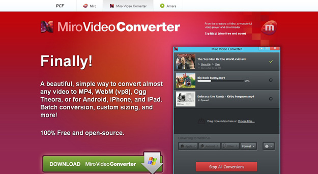 Miro Video Converter是一款開源免費的視屏轉(zhuǎn)換器,它易于使用。你可以使用該工具將視頻轉(zhuǎn)換為WebM, OGG, or MP4.除此之外,它可根據(jù)個人移動設(shè)備的屏幕轉(zhuǎn)換視頻。它有windows和MAC兩個平臺的版本。