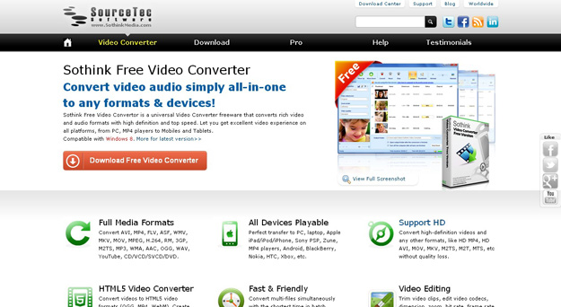 Sothink是一個通用視頻轉(zhuǎn)換器,它支持所有通用音頻和視頻,包括HD格式。同時它也支持MP4, OGG, and WebM格式并可為用戶創(chuàng)建HTML5視頻代碼。除此之外,還具備一些視頻編輯的特性如,可以截取視頻文件,改變音視頻的質(zhì)量。