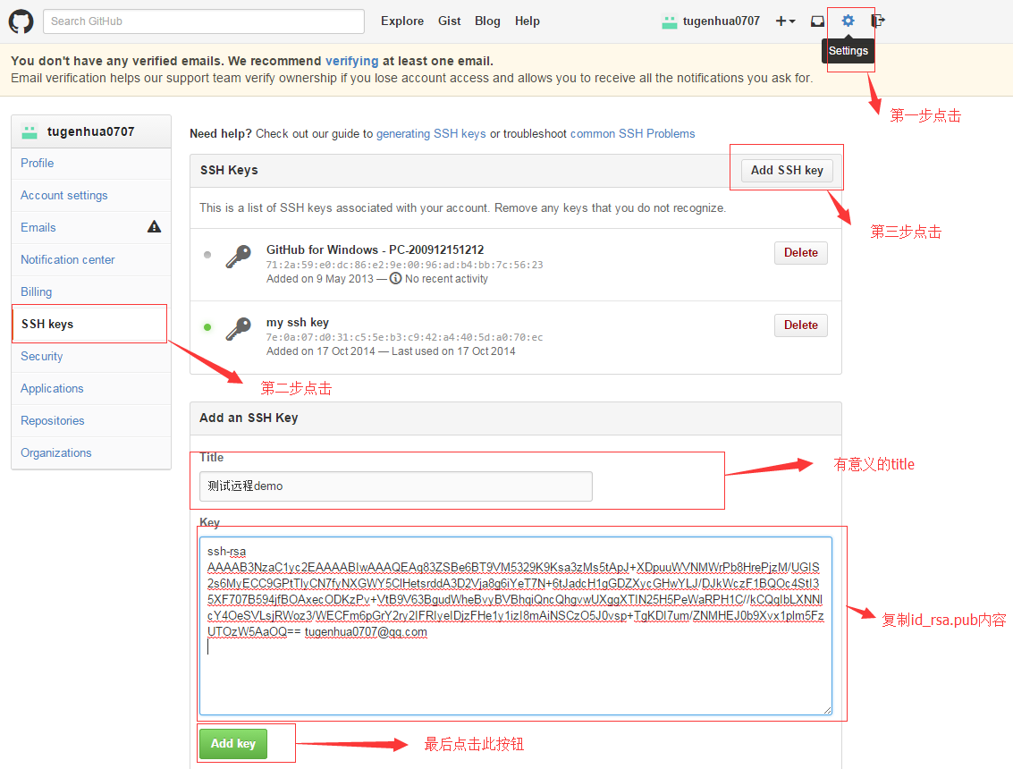 第二步:登錄github,打開” settings”中的SSH Keys頁面,然后點(diǎn)擊“Add SSH Key”,填上任意title,在Key文本框里黏貼id_rsa.pub文件的內(nèi)容。