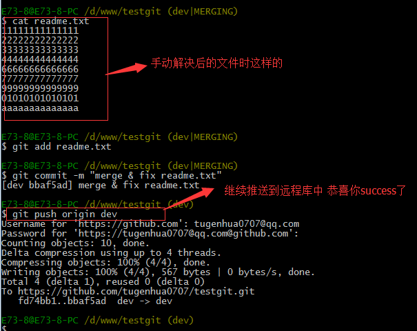 現(xiàn)在手動(dòng)已經(jīng)解決完了,我接在需要再提交,再push到遠(yuǎn)程庫里面去。如下所示: