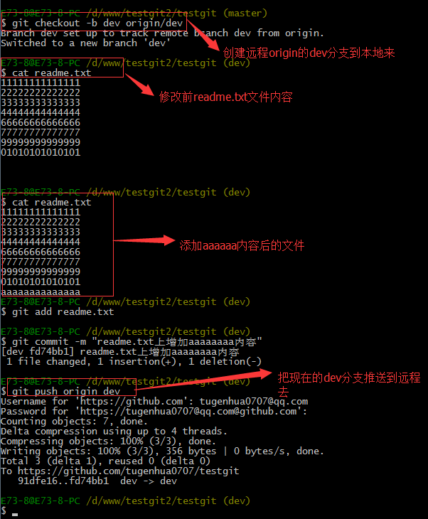 現(xiàn)在我想把本地更新的readme.txt代碼推送到遠(yuǎn)程庫中,使用命令如下:
