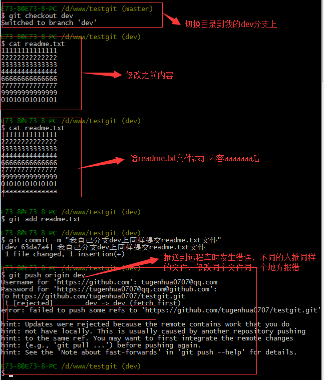 小伙伴們已經(jīng)向origin/dev分支上推送了提交,而我在我的目錄文件下也對(duì)同樣的文件同個(gè)地方作了修改,也試圖推送到遠(yuǎn)程庫時(shí),如下:
