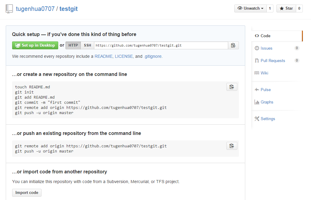 現(xiàn)在,我們根據(jù)GitHub的提示,在本地的testgit倉庫下運(yùn)行命令: