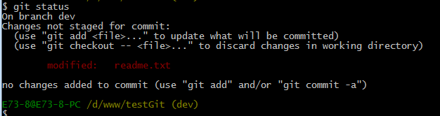 我們?cè)趓eadme.txt再添加一行內(nèi)容為4444444,接著在目錄下新建一個(gè)文件為test.txt 內(nèi)容為test,我們先用命令 git status來查看下狀態(tài),如下: