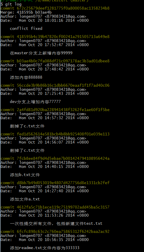 git log命令顯示從最近到最遠(yuǎn)的顯示日志,我們可以看到最近三次提交,最近的一次是,增加內(nèi)容為333333.上一次是添加內(nèi)容222222,第一次默認(rèn)是 111111.如果嫌上面顯示的信息太多的話,我們可以使用命令 git log –pretty=oneline 演示如下: