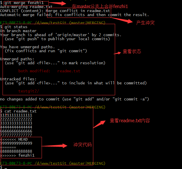 現(xiàn)在我們需要在master分支上來合并fenzhi1,如下操作: