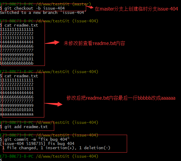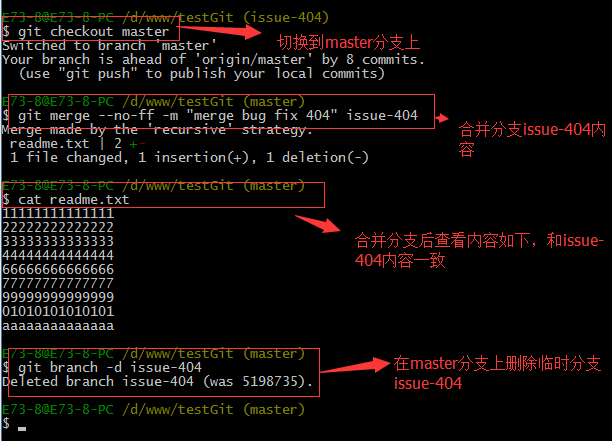 修復(fù)完成后,切換到master分支上,并完成合并,最后刪除issue-404分支。演示如下:
