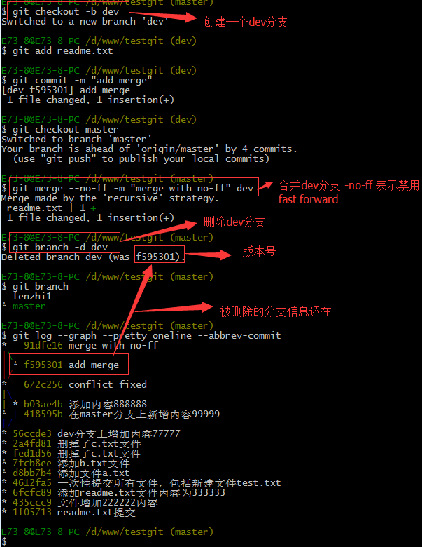 - 合并dev分支,使用命令 git merge –no-ff -m “注釋” dev