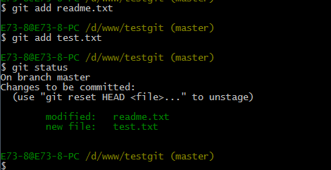 現(xiàn)在我們先使用git add 命令把2個(gè)文件都添加到暫存區(qū)中,再使用git status來查看下狀態(tài),如下: