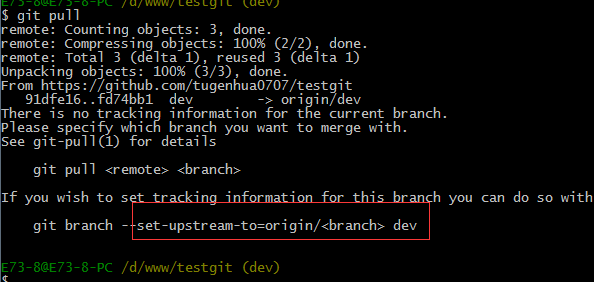 git pull也失敗了,原因是沒有指定本地dev分支與遠(yuǎn)程origin/dev分支的鏈接,根據(jù)提示,設(shè)置dev和origin/dev的鏈接:如下: