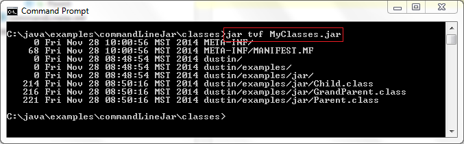 列出(或者查看)一個JAR,WAR,或者EAR文件的內(nèi)容可能是我最想使用的jar命令功能。我通常使用選項“t”(列出歸檔內(nèi)容),“v”(verbose)和“f”(在命令行指定文件名)來列出文件內(nèi)容。下一個屏幕快照展示了運行命令 jar tvf MyClasses.jar去查看我生成的JAR文件的內(nèi)容。