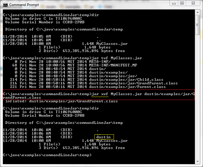 我有時僅僅需要去查看獲取使用歸檔文件中的一個或者兩個文件。盡管我可以明確地把它們?nèi)继崛〕鰜砭庉嬑倚枰庉嫷奈募?,就像在上面那個例子展示的一樣。但是我想僅僅去提取我需要的少量文件。使用命令jar xvf命令就可以輕松做到。通過在文件名后指定特定的權(quán)限定名,我可以僅提取出我指定的文件。這有一個好處:我不用被我不需要的文件占滿了我的目錄并且在我完事后不需要費心去清理無用文件。下一個屏幕快照展示了運行命令jar xvf MyClasses.jar dustin/examples/jar/GrandParent.class去提取一個單一的文件,而不是提取全部文件。