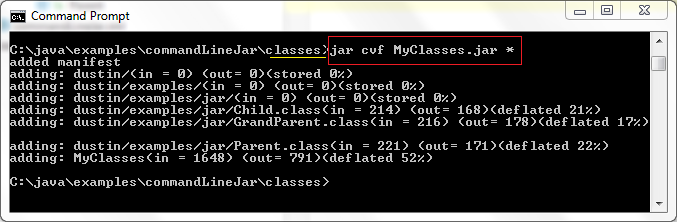 下一個屏幕快照展示了一個使用jar cvf的簡單例子。我進把我的目錄切換到“classes”目錄下,目的是使創(chuàng)建一個JAR跟運行jar cvf或者 jar cvf一樣簡單。所有在當(dāng)前目錄下的文件和子目錄下的文件都會被打包為JAR文件。這個過程在下個屏幕快照展示。
