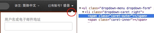 一般比較專業(yè)的網(wǎng)站在細(xì)節(jié)上都處理得非常好,從裝飾元素就可以看出來。因?yàn)楹芟矚g的 Twitter 的設(shè)計(jì),有一陣子我就把它的首頁自己實(shí)現(xiàn)了一遍(可以在這里查看,請用 Chrome 瀏覽器,因?yàn)橥祽袥]用考慮瀏覽器差異)。在抄襲的過程中,我發(fā)現(xiàn)即使在一些常人不會注意到的細(xì)節(jié)上它都努力做到盡善盡美。比如說輸入框上面的 placeholder 其實(shí)是用 span 浮動在上面,因?yàn)樵?placeholder 沒那么豐富的效果。還有彈出窗口的那個小三角,乍看之下沒什么,但如果你查看代碼結(jié)構(gòu),會發(fā)現(xiàn)有兩層: