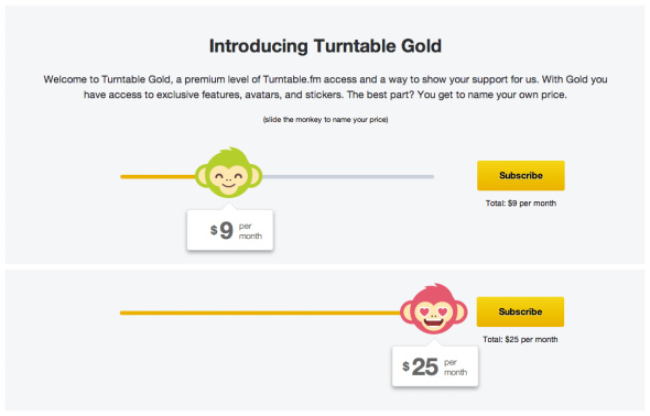 在產(chǎn)品的一些流程中,使用一些情感化的表現(xiàn)形式能對(duì)用戶的操作提供鼓勵(lì)、引導(dǎo)與幫助。用這些情感化設(shè)計(jì)抓住用戶的注意,誘發(fā)那些有意識(shí)或者無(wú)意識(shí)的行為。 在Turntable.fm中的訂閱模式中有一個(gè)滑塊,你付多少錢(qián)決定了猴子欣喜若狂的程度。在涉及到真金白銀的操作中,給用戶賣(mài)個(gè)萌也許有奇效。