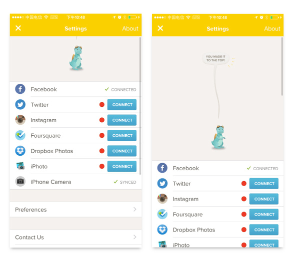 類似的地方還有下圖,在設(shè)置頁(yè)面頂部向下拖動(dòng)會(huì)有一只搖動(dòng)的小恐龍,在用戶順著他的引導(dǎo)不斷下拉,拉到頭,會(huì)發(fā)現(xiàn)這是一個(gè)對(duì)話的氣泡,藍(lán)色的小恐龍說(shuō)了句“You made it to the top!(你拉到了最頂端?。保a(chǎn)品“詼諧有趣”的氣質(zhì)便從這些隱秘于界面細(xì)節(jié)之中的設(shè)計(jì)傳遞給了用戶。