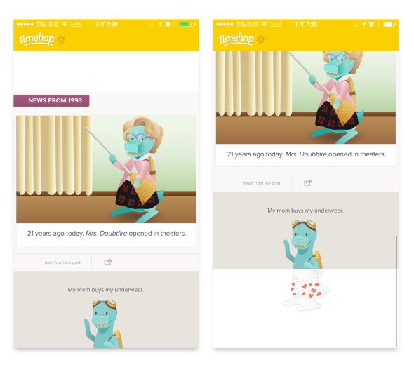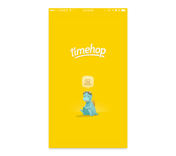 Timehop是一款讓你回顧那年今日的App,它可以幫你把去年今日寫(xiě)過(guò)的Twitter,F(xiàn)acebook狀態(tài)和拍過(guò)Instagram照片翻出來(lái),幫你回顧過(guò)去的自己。Timehop為自己的產(chǎn)品塑造了一個(gè)藍(lán)色小恐龍的吉祥物形象。許多小恐龍貫穿于界面之中,用吉祥物+幽默文案的方式來(lái)將品牌形象的性格特點(diǎn)和產(chǎn)品氣質(zhì)傳達(dá)出來(lái)。 用戶在打開(kāi)App時(shí)就能感受到小恐龍的存在,閃屏中一個(gè)小恐龍坐在地上說(shuō)了句“Let’s time travel”,立馬將用戶從情感上帶入了App的主題——時(shí)間之旅。