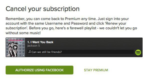 在用戶將要流失前,給予用戶情感化的元素也許能挽留下一部分的用戶。當(dāng)你想取消訂閱Spotify時(shí),Spotify會(huì)在取消訂閱的網(wǎng)頁(yè)上為用戶播放Jackson 5的“Want you back”。