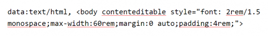 通過使用 HTML5 的「contenteditable」屬性,就能將瀏覽器的標簽頁轉變成記事本。這個功能很簡單,只需要將如下代碼復制到地址欄點擊回車鍵,就會出現一個簡潔的不能再簡潔的空白頁面,再點擊這個空白頁面,就可以開始在頁面上輸入內容。如果你保存這個頁面,你就會得到一個 HTML 文件,當你打開這個文件時,你就能看見你之前輸入的內容了。