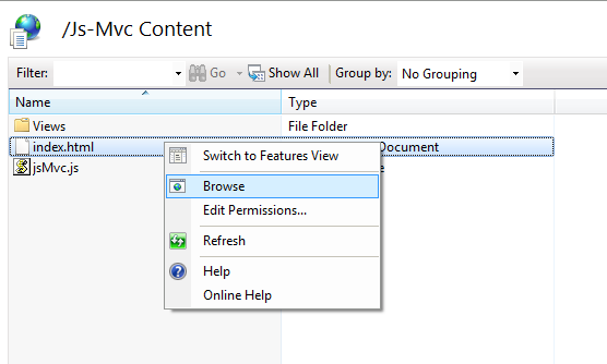 跑在服務(wù)器里是必要的,因為代碼加載從存儲于外部文件中的視圖,瀏覽器不會允許我們的代碼在非宿主服務(wù)器環(huán)境下執(zhí)行。當(dāng)然如果你使用Visual Studio那么直接在目標(biāo)html文件上右鍵,選擇‘View In Browser’即可。