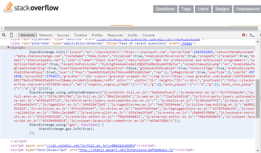 正如你看到的,StackOverflow 注入了一些個(gè)人的設(shè)置,如 isNoticesTabEnabled。這個(gè)簡單的JSON代碼片段為你使用靜態(tài)JavaScript文件自定義行為提供了必要的數(shù)據(jù)支持。為了實(shí)現(xiàn)這一點(diǎn),需要序列號(hào)服務(wù)器端類為JSON,然后放置在<head>中。然后你可以在靜態(tài)的JavaScript文件中根據(jù)需要參考這個(gè)數(shù)據(jù)結(jié)構(gòu),能夠使用它,是因?yàn)樗蛔⑷氲?lt;head>中。