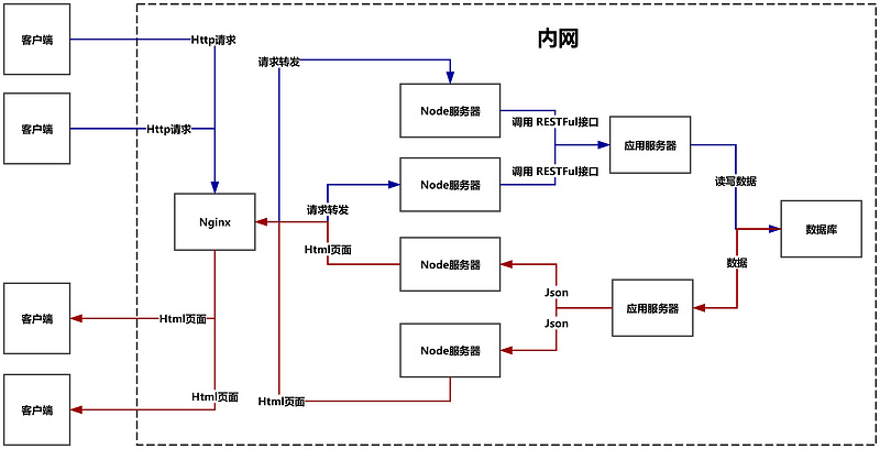 第三種方法:客戶端-負載均衡器(Nginx)-中間服務器(Node)-應用服務器-數(shù)據(jù)庫