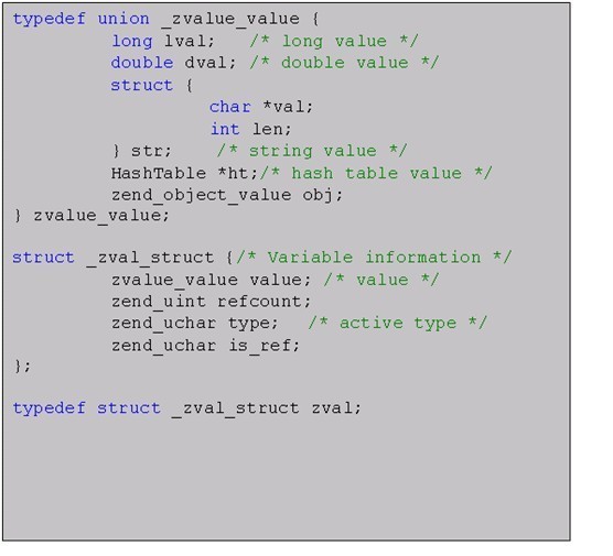 Zval是zend中另一個(gè)非常重要的數(shù)據(jù)結(jié)構(gòu),用來標(biāo)識并實(shí)現(xiàn)PHP變量,其數(shù)據(jù)結(jié)構(gòu)如下: