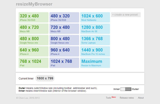 resizeMyBrowser是一個(gè)響應(yīng)式網(wǎng)頁(yè)設(shè)計(jì)工具,允許你選擇需要測(cè)試的瀏覽器尺寸。用戶可以在15種不同的預(yù)設(shè)尺寸中選擇或輸入自定義的尺寸。