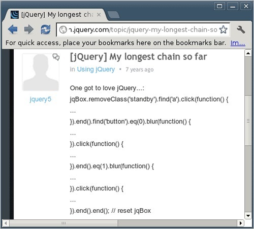 $(“div”)將頁面上所有的div元素獲取到然后作為jQuery對(duì)象的一部分返回?;趈Query對(duì)象調(diào)用animate方法,然后再在每個(gè)jQuery對(duì)象上執(zhí)行append。這樣的作用鏈可以很長(zhǎng)很長(zhǎng),下面這個(gè)是典型的長(zhǎng)jQuery方法鏈: