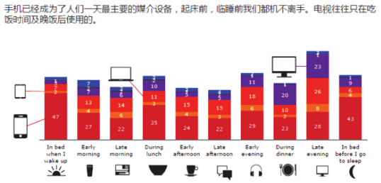 以電視為例,人們不是不看電視了,而是時(shí)長(zhǎng)被壓縮(只在吃飯時(shí)間和晚飯后的一段時(shí)間),注意力被分割(36%的人在看電視的同時(shí)使用其他上網(wǎng)設(shè)備,這一變化導(dǎo)致的影響后面會(huì)詳談)。