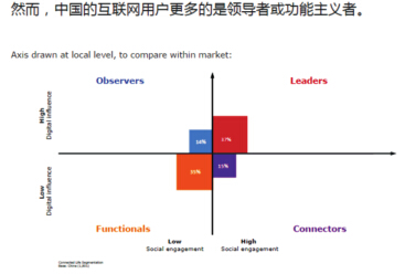另一個(gè)重要的營(yíng)銷機(jī)會(huì)出現(xiàn)在對(duì)用戶行為的洞察上。以社會(huì)交際水平為X軸,以數(shù)字媒體關(guān)注度為Y軸,用戶根據(jù)行為可以被分為觀察者、領(lǐng)導(dǎo)者、連接者、功能主義者四大類。中國(guó)互聯(lián)網(wǎng)用戶呈現(xiàn)出明顯的兩極:領(lǐng)導(dǎo)者占37%,功能主義者占35%,觀察者和連接者分別只占14%和15%。