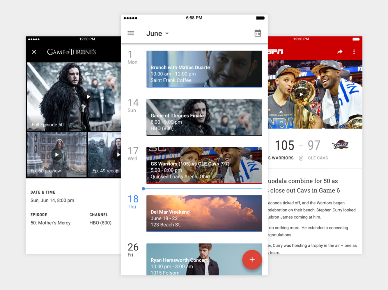 借助第三方APP生成的事件詳情,會遠比手動添加的日歷事件來的全面和翔實,甚至會引入充滿吸引力的可交互的組件。用戶對于內容豐富可交互的多媒體充滿的期待,使用簡單的純文本來呈現(xiàn)信息,是對用戶需求的極大忽視。在我的概念設計中,日歷應用將會提供對多媒體和相關應用的即時訪問功能,比如可以直接訪問HBO GO的電視劇集預告片,可以調用ESPN 的體育集錦,甚至可以直接發(fā)送現(xiàn)場直播的推文。