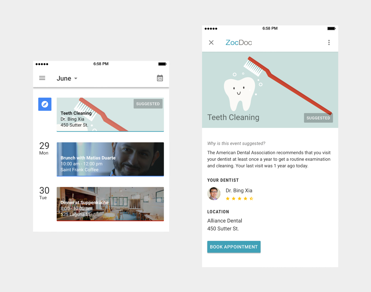 考慮到日歷是如此的懂你,如此的了解這個世界,所以不妨讓日歷來幫你管理哪些容易錯過和重要的事件與約會。在下面的案例中,日歷結合你之前的就醫(yī)記錄和ZocDoc所提供的信息,提醒你是時候去訪問牙醫(yī)了。